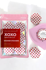 Our Shower Steamers are Handmade in Hillsboro, Missouri using clean, simple ingredients only. -Each shower steamer is dye-free -Individually wrapped with instructions -About 1 oz. each , 2 inches in diameter and about a half inch thick -6 Shower Steamers in a Resealable Pack XOXO is scented in a beautiful blend of orange, tangerine, peach, freesia, lilac, jasmine, sandalwood and light musk