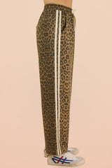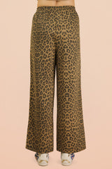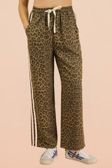 Leopard Printed Cotton Twill Tape Detail Pants Elastic Waist W/ Tie Side Pockets