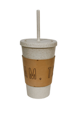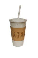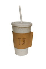 Leather-wrapped travel tumbler made of Eco-friendly Wheat Bioplastic with double-wall construction for insulation of hot or cold liquids.