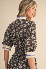 + Floral print contrast binding scallop trim midi dress + V neckline in contrast binding and scallop trim + Contrast binding waistband + Shirred elastic waistband on back + Elbow length puff sleeves + Buttoned cuffs in contrast binding and scallop trim + Tiered seam midi skirt + Pockets + Lined + Hidden side zipper + Model is 5' 10.5" 32-24-36 and wears a Small