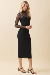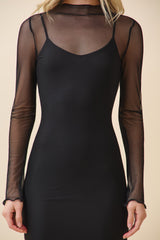 - Long Sleeve - Ribbed - Mesh Detail - Midi Length - Mock Neck - Merrow Hem Detail at the Bottom - 95% Polyester, 5% Spandex