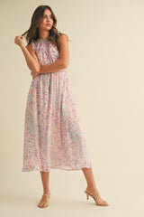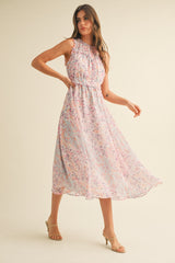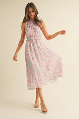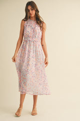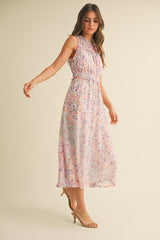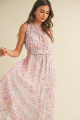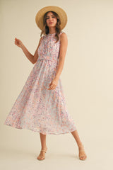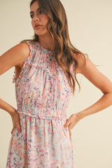 + Ruffle trim floral midi dress + &merci exclusive print + High round neckline with ruffle trim + Sleeveless + Ruffle trim detail on yoke, center front, and armholes + Elastic waist with ruffle trim + Lace trim detail on waist + Lined + Model is 5' 7" 33-24-34 and wears a S