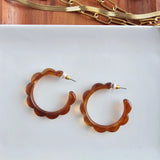 Bold, Playful, and Utterly Chic Our Scarlet Hoops are here to turn heads—in the prettiest way possible. Made from glossy resin and shaped in a unique scalloped silhouette, these hoops bring a modern twist to a classic shape. The rich amber hue adds a pop of color that’s equal parts bold and wearable. Lightweight enough for everyday, yet striking enough for special occasions—these beauties are a go-to for dressing up jeans and a tee or adding polish to a night-out look.