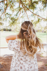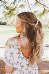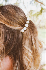 The 80's banana clip is back. The most popular way to use a banana clip is to pull hair into a ponytail, which makes hair appear to cascade down like a waterfall. Not only is it wildly flattering, but it only takes seconds to put together. A perfect style that allows us to skip shampoo day and will help us get out of bed and looking cute in the morning. This clip has the most gorgeous circle pearlescent pendents on it and is perfect for dressing your hair up. I'm obsessed. It is about 4 inches long and can accommodate medium thickness hair.