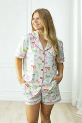 This set features a button-front shirt and a matching elastic-band short with pockets and button detail on the front.