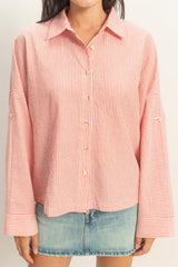 neckline, full long sleeves, and a full front button placket. The