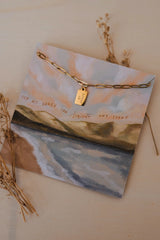 Displayed on a textured card featuring beautiful artwork by Lauren Ferguson of The Golden Designs. Full verse reference included on the back of the card.