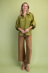 Satin Balloon Sleeve Button Down Blouse with a Wavy Hem and Stitching Details Model is 5'8" wearing a small.