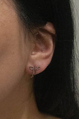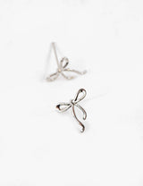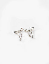 A thin silver bow charm earrings with curled ends. * Brass * Rhodium Plating Measurements: * 0.45 in. x 0.4 in. / 1.14 cm x 1.02 cm