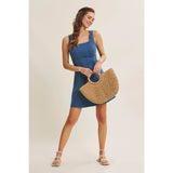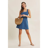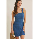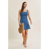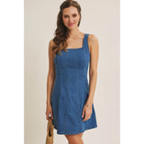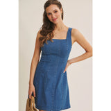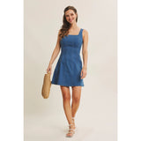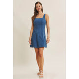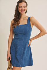 A true IN FEBRUARY bestseller, reintroduced for everyday ease. This denim mini dress is designed with a softly structured fit that naturally defines the waist and flatters the silhouette without feeling restrictive. The square neckline adds a clean, feminine balance, while the fit-and-flare shape creates gentle movement with every step. Crafted from a stretchy cotton-blend denim, it offers comfort you can wear all day. Polished enough for outings, effortless enough for daily wear. The sleeveless cut layers beautifully under knits or jackets, making it a year-round favorite for customers who want an easy yet refined look. Finished with a back zipper for a smooth fit, this is the kind of everyday dress that customers come back for. Timeless, flattering, and endlessly wearable.
