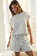 Sleeveless techno top with ruffled arm openings, paired with matching pull-on shorts and a drawstring hem detail.