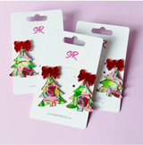 Add a splash of holiday cheer with these hand-painted Christmas tree dangles in festive shades of red, green, pink, blue, and gold, topped with a shiny red mirrored bow. Each pair is a true work of art, with colors that vary to make your earrings uniquely yours—a perfectly preppy touch for your Christmas celebrations!