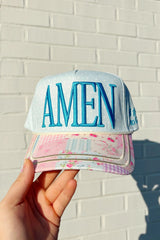 Patchwork Poppy & Pine floral hat with AMEN embroidery.