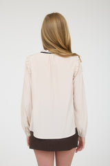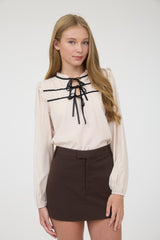 Ribbon Bow Tie Yoke Detail Long Sleeve TopROUND NECKLINE SPLIT NECK DETAIL LONG SLEEVES ELASTIC CUFF DETAIL CONTRAST RIBBON BOW TIE YOKE DETAIL NOT LINED WOVEN TOP 60% POLYESTER 40% RAYON
