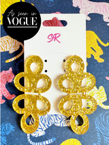 Make a statement with these stunning gold lamé acrylic dangle earrings, as photographed and featured on Vogue.com. With their bold shape and radiant shimmer, these earrings are the perfect finishing touch for a night out, special occasion, or whenever you’re ready to shine.