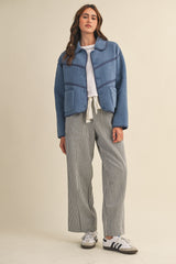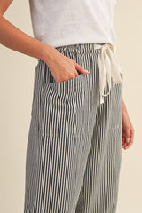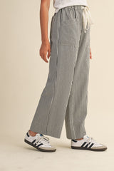 + Striped wide leg pants + High rise waist + Covered elastic waistband + Contrast drawstring detail + Front and back patch pockets + Wide leg + Model is 5' 7.5" 30-25-36 and wears a S
