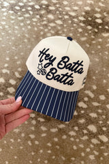 Swing into spring with this playful navy striped baseball hat featuring a cheeky "Hey Batta Batta" embroidered design—available now for pre-order.
