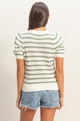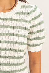 ribbed eyelet knit and horizontal stripes. It has a scalloped crew