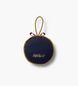A keepsake gift or heirloom accent for your own tree, this ornament features embroidered illustrations, gold thread detailing, twisted piping, and a loop for hanging.