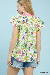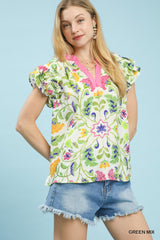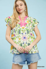 Mix Floral Flutter Sleeve V-Neck TopKey Features• Split V-neck • Short flutter sleeves• Contrast trim • Not Lined Fit & Model Notes• Model is 5'9" and is wearing a small.• All Measurements are approximate.Fabric Contents• 80% Viscose• 20% Nylon