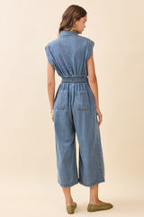 Sleeveless denim jumpsuit featuring a collared neckline and