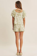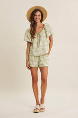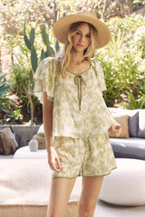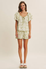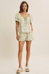 days or vacations. Features - Matching shorts: J2759P - Crinkled rayon fabric - Floral print - Sweetheart neck - Contrast binding - Double layered ruffle short sleeves - Center bow - Back ribbon tie - Lined