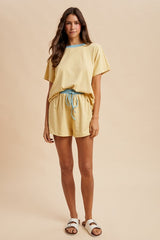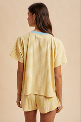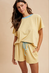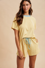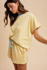 Butter + Sky LOOSE FIT STRIPED KNIT TOP & SHORTS CASUAL SET - BRUSHED KNIT - STRIPE PATTERN - CONTRAST NECK ACCENT - DOLMAN SHORT SLEEVE - ELASTICIZED WAIST - CONTRAST DRAWSTRING