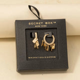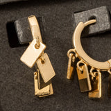 Add a touch of elegance and glamour to your look, this pair of hoop earrings reveals an intricate secret box gold dipped tag charms design. Make a lasting impression with this versatile pair of hoop earrings, a subtle yet impactful addition to your fashion repertoire. Available in GD, WG. This item is sold in packs of 1. This pair of hoop earrings is made with 100% Brass.
