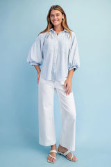 Striped Balloon Sleeve Button Down Blouse with a Wavy HemModel is 5’8” wearing a small.