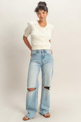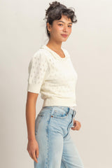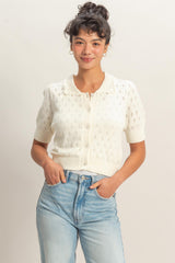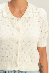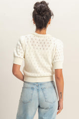 Pointelle Collar Button-up Puff Sleeve Knit Top