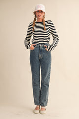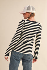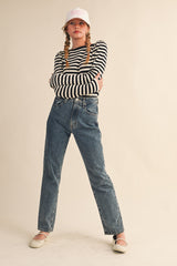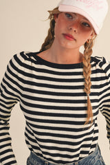 + Striped boat neck sweater + Boat neckline + Gathered puff shoulders + Long sleeves + Waist length fit + Fitted bodice + Model is 5' 7.5" 30-25-36 and wears a S