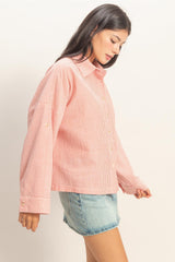 neckline, full long sleeves, and a full front button placket. The