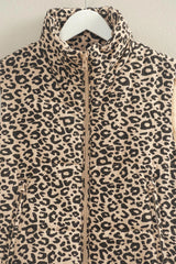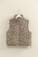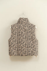 Make a statement with this standout leopard print puffer vest. Ideal for layering, this vest offers a structured silhouette, enhancing any outfit with a touch of wild sophistication.