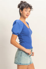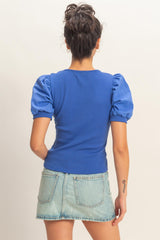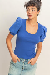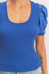 This top has a cotton spandex ribbing bodice and gathered puff