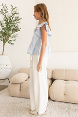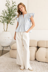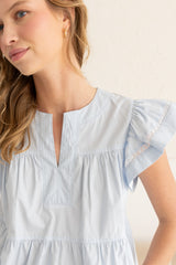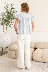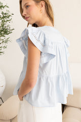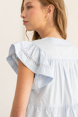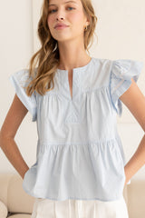 This flutter sleeve top is a blend of charm and sophistication, perfect for casual and semi-formal occasions. Featuring a split neckline, tiered design, and intricate embroidered details on the sleeves, it offers a timeless look with a modern touch. Pair it with jeans, skirts, or tailored shorts for effortless style. Features Split neckline for a polished yet relaxed look Flutter sleeves with embroidered detailing for added elegance Tiered structure for a flattering, flowy silhouette Lightweight fabric for comfort and breathability Versatile design suitable for casual outings or dressed-up occasions