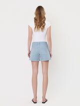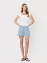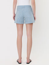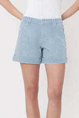 HIGH RISE CUFFED STRIPED A LINE SHORTS COMFORT STRETCH DENIM, HIGH RISE WAIST, SLANT POCKETS, SINGLE CUFF
