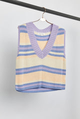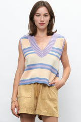 Elevate your layering game with our striped V-neck knit vest. This versatile piece is crafted from high-quality knit fabric, ensuring both style and comfort. The bold stripes and classic V-neck design make it a trendy addition to any outfit. Perfect for layering over shirts or wearing on its own, this vest is a must-have for any fashion-forward wardrobe. striped fitted knit top, black and white striped top, casual knitwear, women's fitted top, short sleeve knit top, classic stripe pattern, crew neck top, chic casual top, versatile striped top, modern knitwear.