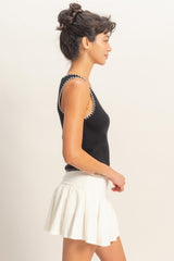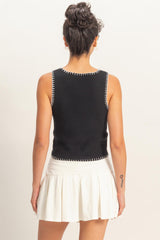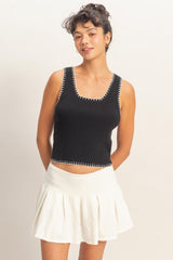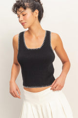 Ribbed Blanket Stitch Square Neck Tank Top - Black