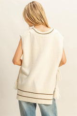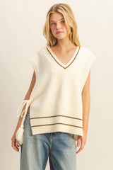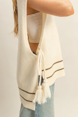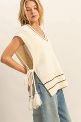 Perfect for fashion-forward layering, this sweater vest showcases style and comfort with its unique silhouette. Featuring a deep V-neckline that adds a touch of daring elegance, this vest is framed by finely ribbed hemlines and contrast striping that visual interest. Tassel ties at the sides introduce a playful element, giving it a customizable fit and bohemian flai.