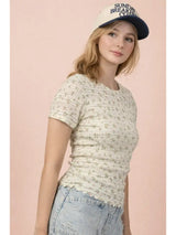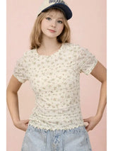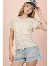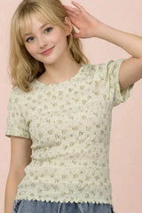 - Floral Print Fitted Casual Top- Round Neck- Short Sleeve- Lettuce Hem- Easter Outfit