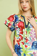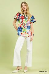 Mix Floral Short Sleeve Top with Contrast Trim