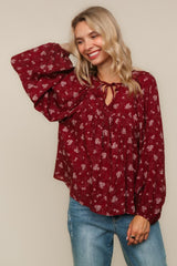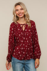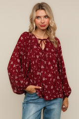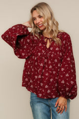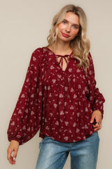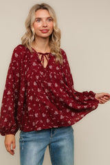 V NECK WITH STRING RIBBON YOKE DETAIL BUBBLE LONG SLEEVE FLORAL PRINT WOVEN PEASANT BLOUSE TOP