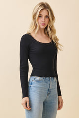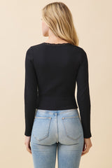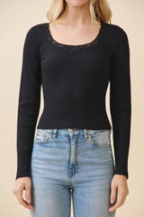 - Long Sleeve - Scoop Neck - Lace Trim on Neck - Satin Bow Detail - Ribbed - Semi Cropped - 60% Cotton, 5% Spandex - Imported. Designed in USA.
