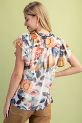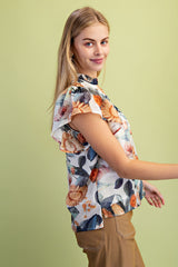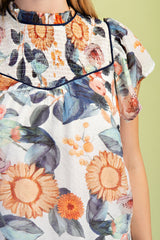 Floral Smocked Neck Blouse with Ruffled Sleeves and Binding Details. The Top is Lined