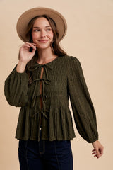 TEXTURED WOVEN SMOCKING DETAIL TIE FRONT BLOUSE - TEXTURED WOVEN FABRIC - SMOCKING BODICE - FRONT TIE CLOSURE - PUFF SLEEVE - PEPLUM - RELAXED FIT