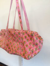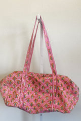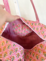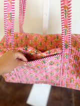 Add a pop of color to your summer style with our Aster Floral Print Quilted Tote Bag. This quilted cotton bag features a playful pink and green floral print, making it a fun and stylish accessory. Perfect for carrying all your essentials in a unique and trendy way!