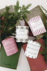 Our holiday candle collection features four festive scents. Each candle is wrapped in a high quality wrapper, and each jar has a scent label on it. This collection is 100% soy wax and hand poured by our team, in a classic glass jar.