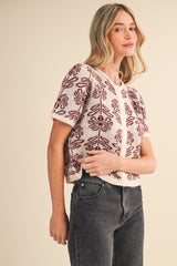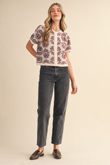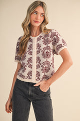 + Floral knit short puff sleeve sweater cardigan + Ribbed round neck + Short puff sleeves + Button down placket + Relaxed fit + Ribbed hem + All-over floral knit design + Model is 5' 7.5" 30-25-36 and wears a S