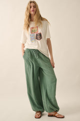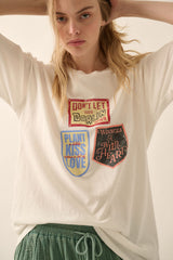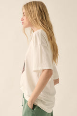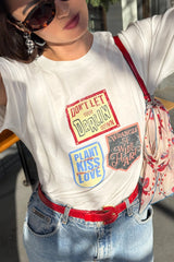 A garment washed graphic t-shirt with the following features: Vintage-style graphic print with slogans that read "Don't Let Your Darlin' Down," "Plant a Little Kiss Grow a Lot of Love," and "Wrangle a Wild Heart" . Round neckline. Short sleeves. Drop shoulder. Oversized fit. Model Info: Height: 5 ft 9 in | Bust: 32 in | Waist: 24 in | Hips: 36 in | Wearing Size S.