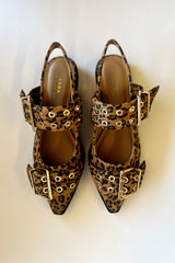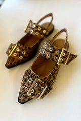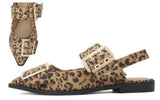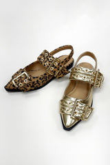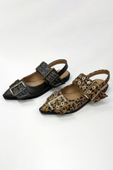Elevate your flat collection with these chic Pointed-Toe Slingback Flats featuring eye-catching double buckle accents and a fashion-forward grommet design. Available in standout patterns like Leopard, Red Patent, and Metallic Gold, these flats are perfect for adding a bold statement to your ensemble. The adjustable slingback strap ensures a secure fit, while the pointed toe silhouette gives it a sleek and modern look. Ideal for boutiques targeting fashion-conscious customers looking for versatile yet striking footwear options.